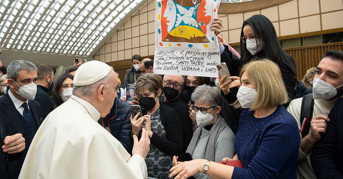 Pope Francis greets people near a banner in Italian calling for the pope’s intervention with Russia, Ukraine and NATO, during his general audience in the Paul VI hall at the Vatican Jan. 19, 2022. (CNS photo/Vatican Media)