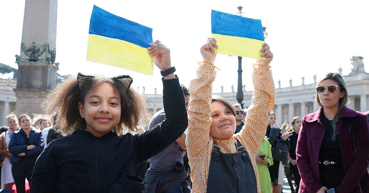 Children hold Ukrainian flags as Pope Francis leads the Angelus from the window of his studio overlooking St. Peter’s Square at the Vatican March 13, 2022. Appealing again for peace in Ukraine, Pope Francis said those who support violence profane the name of God. (CNS photo/Paul Haring)