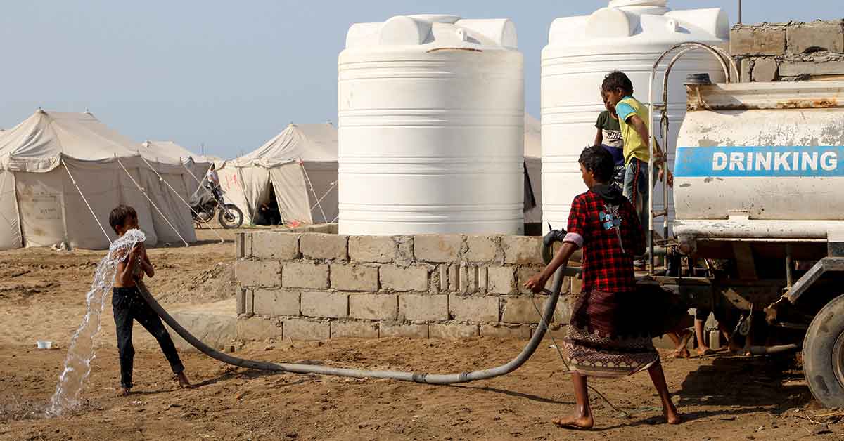 A boy holds a hose of a water tanker truck at al-Wara camp for internally displaced people in the al-Khukha of Hodeida province, Yemen, in this Nov. 21, 2021, file photo. Pope Francis said the real battles people should be fighting are ones against hunger, thirst, disease, poverty and slavery. He made his remarks during a March 21 audience with the volunteer organisation called, “I was thirsty,” which is dedicated to getting potable water to people who have none. (CNS photo/Fawaz Salman, Reuters)