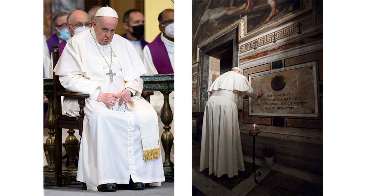 (Left) Pope Francis participates in a Mass marking the 400th anniversary of the canonisations of Sts. Ignatius of Loyola, Francis Xavier, Teresa of Avila, Isidore of Madrid and Philip Neri, at the Jesuit Church of the Gesù in Rome March 12, 2022. (CNS photo/Vatican Media). (Right)