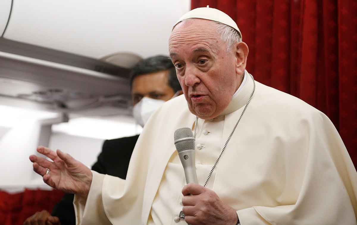 Pope Francis answers questions from journalists aboard his flight from Malta to Rome April 3, 2022. (CNS photo/Paul Haring)