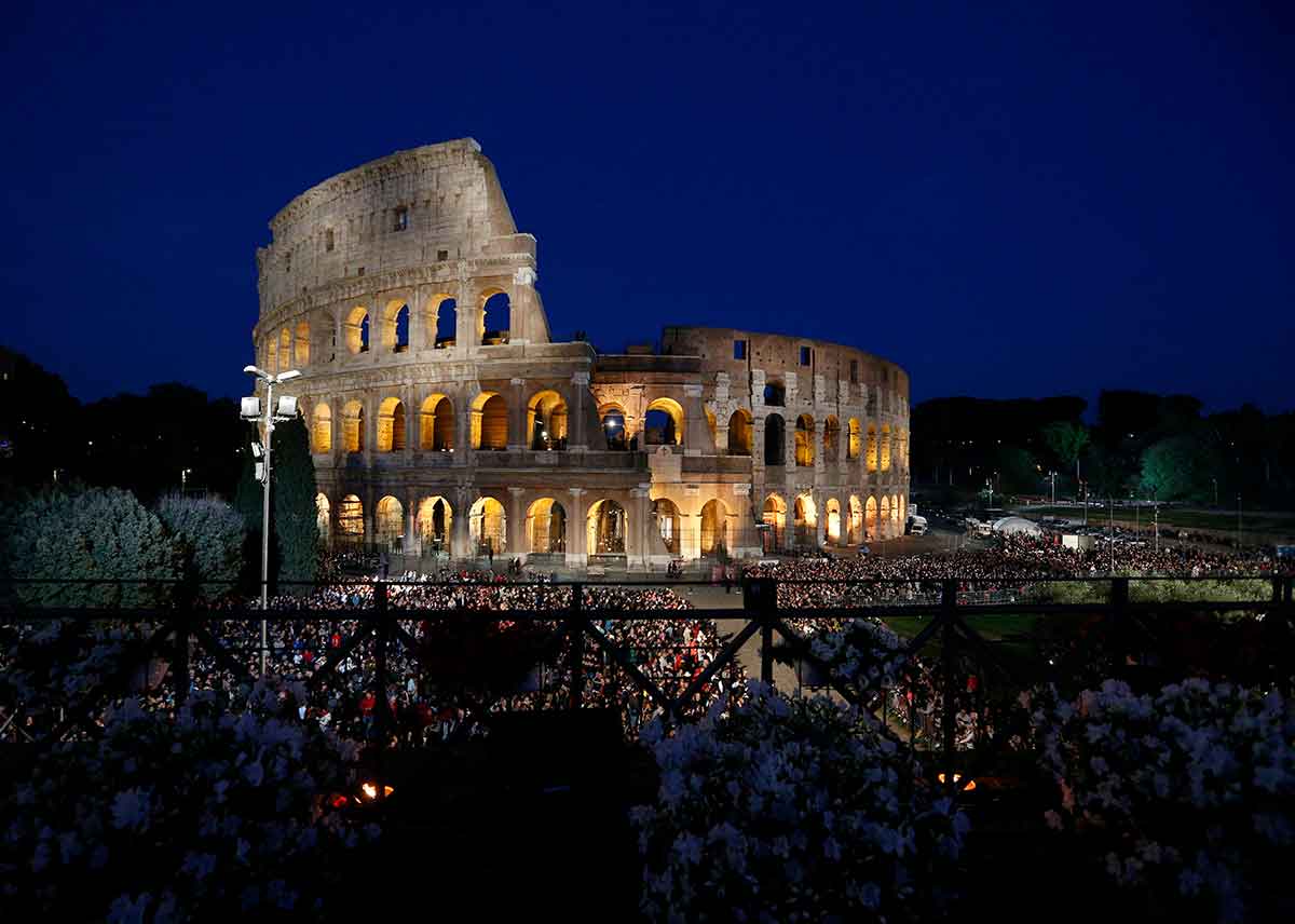 People gather outside Rome’s Colosseum April 19, 2019, before Pope Francis leads the Way of the Cross. People following the Stations of the Cross at the Colosseum this year will find a message of hope, including with a Russian and Ukrainian family carrying a cross together at the nighttime ceremony. (CNS photo/Paul Haring)