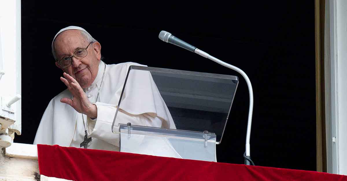 Pope Francis greets people as he leads the “Regina Coeli” from the window of his studio overlooking St. Peter’s Square at the Vatican May 1, 2022. The pope appealed for peace in Ukraine and called the suffering of vulnerable elderly and children a “macabre regression of humanity.” (CNS photo/Vatican Media)
