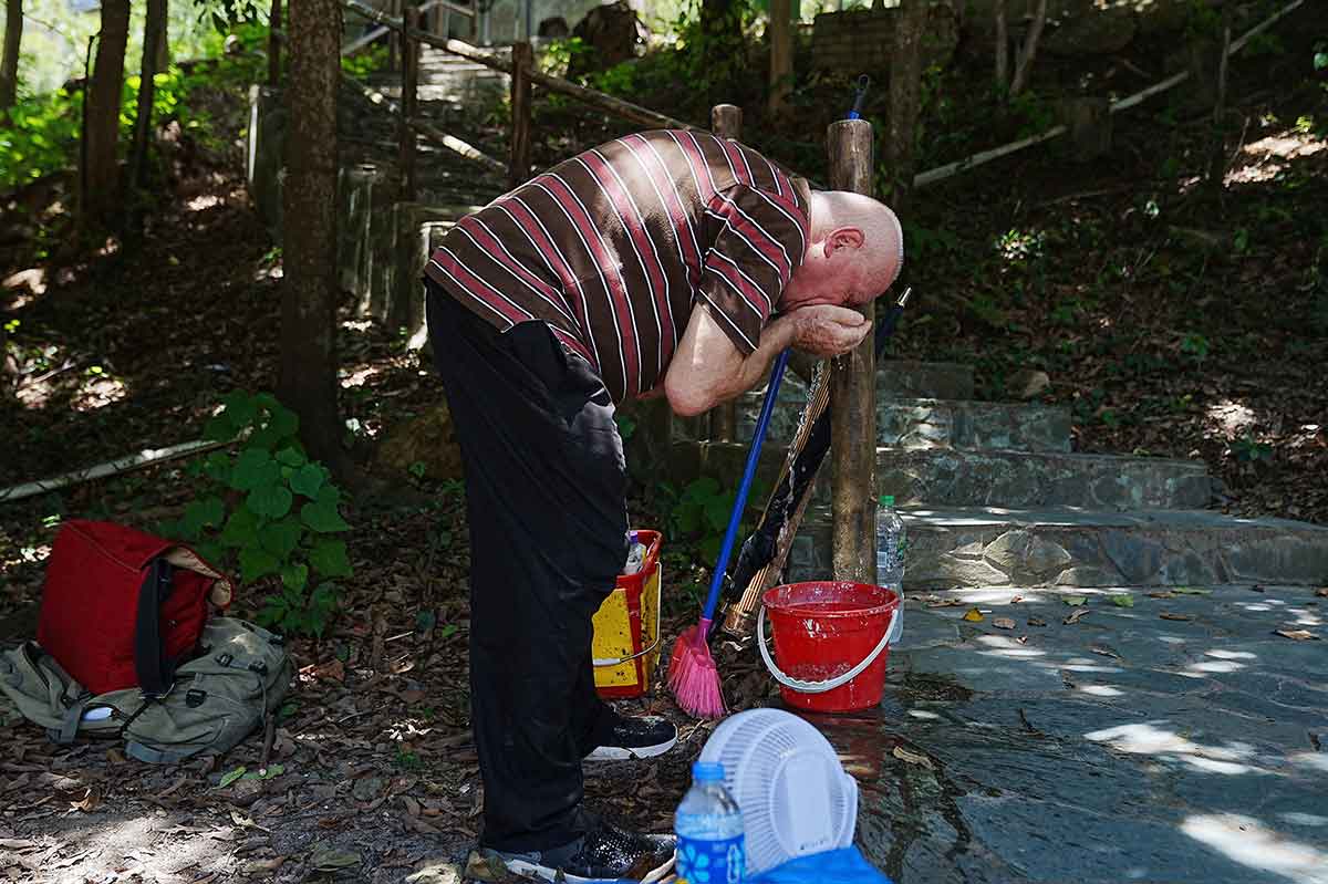 Father Franco Mella, a missionary with the Pontifical Institute of Foreign Missions, washes his face as he begins his hunger strike outside Shek Pik Prison in Hong Kong July 14, 2022. Father Mella is calling for freedom of all political prisoners. The Milan-born priest, who is a longtime rights activist in the Chinese-ruled city, vowed to refuse food as he stood on a dam wall overlooking the prison on an isolated stretch of Hong Kong’s Lantau Island. (CNS photo/Lam Yik, Reuters)