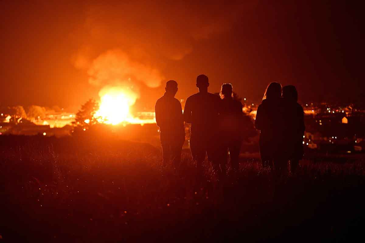 People watch as the completed Craigyhill bonfire burns on the ’11th night’ to usher in the 12th of July celebrations in Larne, Northern Ireland, July 11, 2022. The Police Service of Northern Ireland said it is investigating a possible crime after an image of Pope Francis was burned in another bonfire in Belfast, Northern Ireland. (CNS photo/Clodagh Kilcoyne, Reuters)