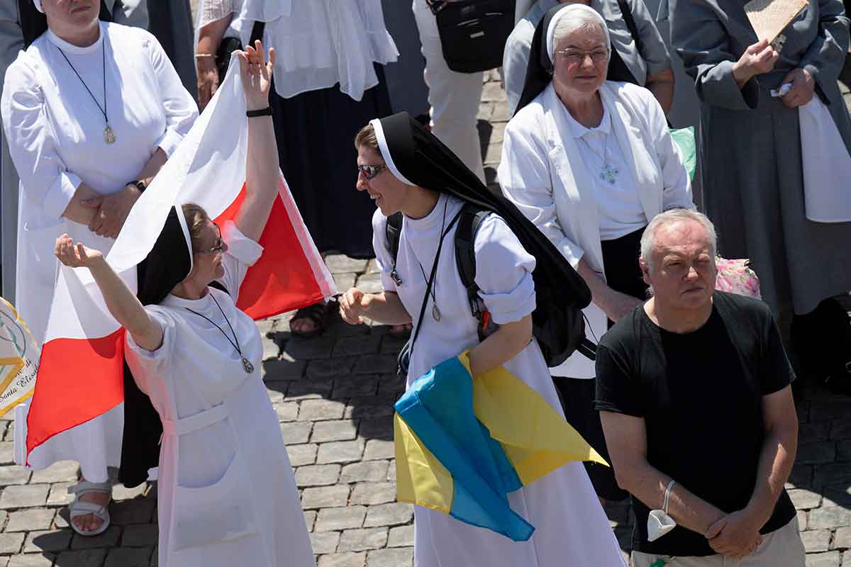 Nuns hold Polish and Ukrainian flags in St. Peter’s Square as Pope Francis leads the Angelus from the window of his studio overlooking the square at the Vatican July 17, 2022. (CNS photo/Vatican Media)
