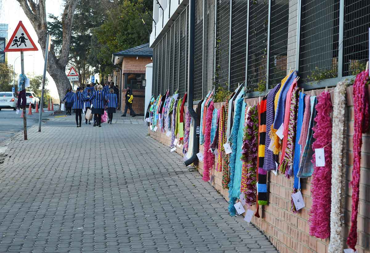 St Teresa’s Senior Primary School, together with 67 Blankets for Nelson Mandela, decorated Keyes Avenue with over 300 brightly coloured scarves. Each scarf, made by our girls and their families and friends, was draped, tied or hung along the fences, poles and trees in Keyes Avenue with a love note reading “I am not lost. If you are cold and need me, please take me.”
