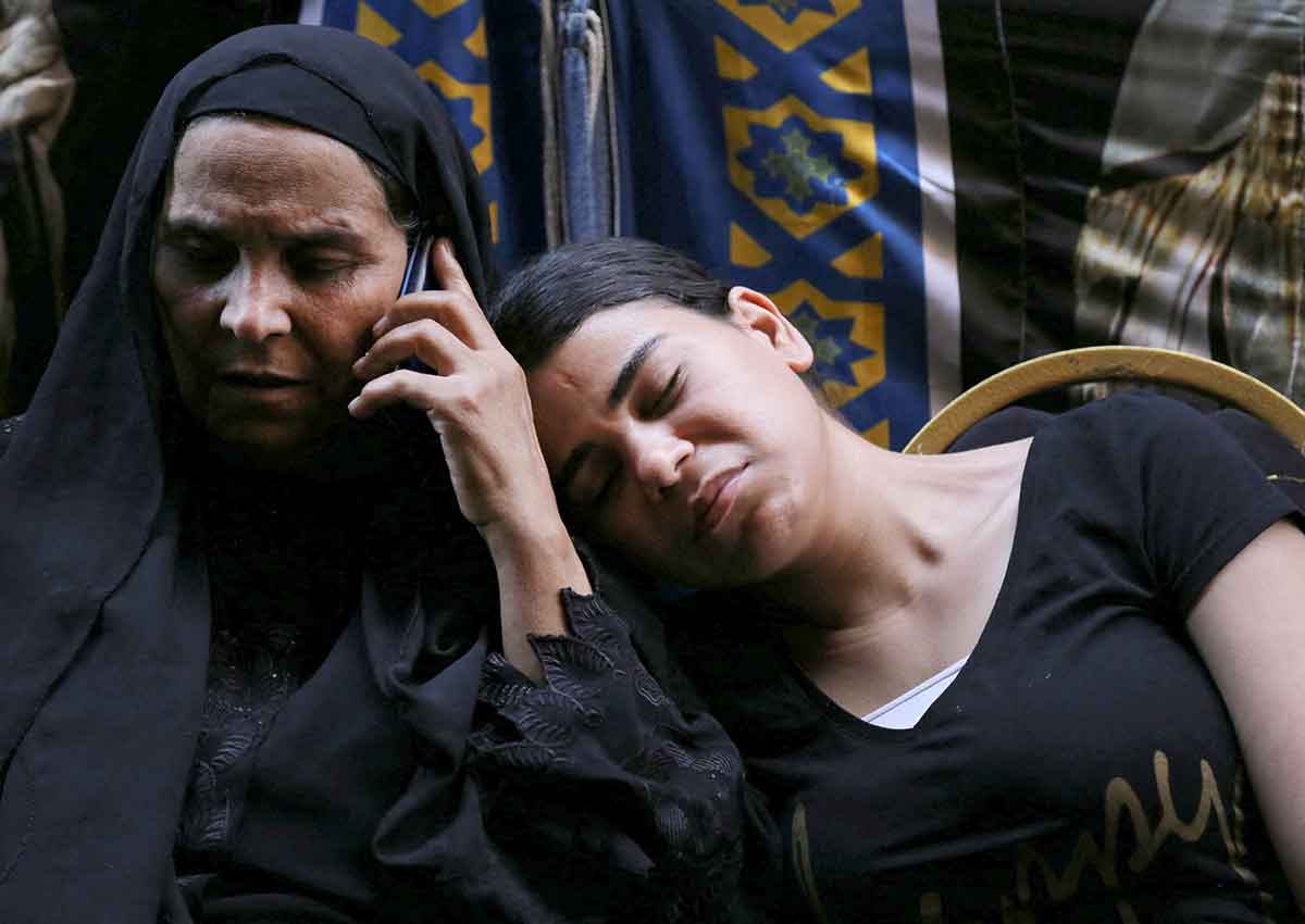 Family and relatives mourn outside their home in Imbaba, Egypt, Aug. 15, 2022, after 13-year-old twins, Bieshoy and Carles Saber, died in a fire at Martyr Abu Sefein Coptic Orthodox Church during Sunday Mass the previous day. (CNS photo/Hanaa Habib, Reuters)