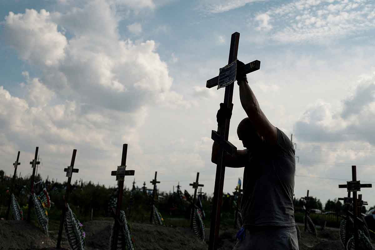 A volunteer places a cross with a number on a grave of an unidentified person during a mass burial ceremony in Bucha, Ukraine, Aug. 17, 2022, as Russia’s attack on Ukraine continues. (CNS photo/Valentyn Ogirenko, Reuters)