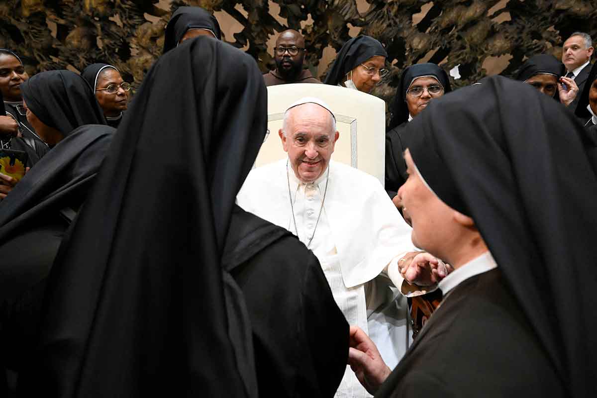 Pope Francis greets a group of nuns during his general audience in Paul VI hall at the Vatican Aug. 10, 2022. (CNS photo/Yara Nardi, Reuters)