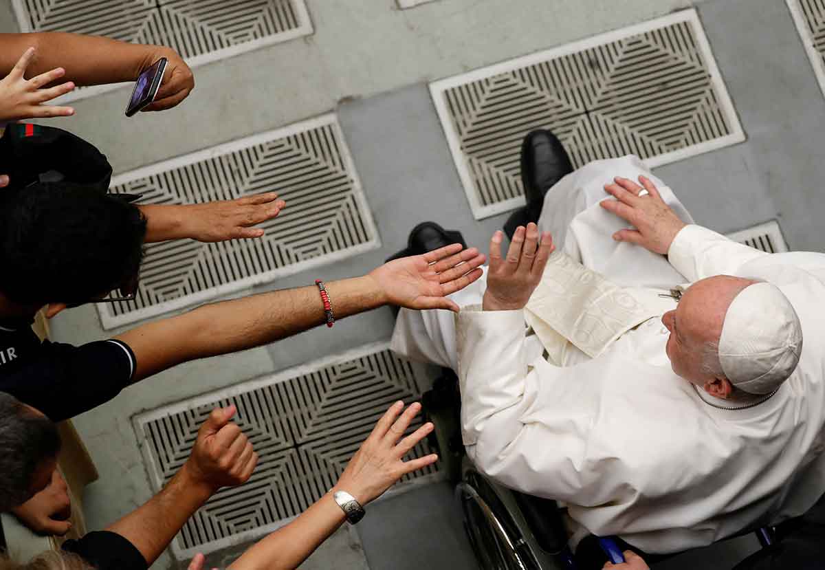 Pope Francis greets people as he arrives for his general audience in Paul VI hall at the Vatican Aug. 10, 2022. (CNS photo/Yara Nardi, Reuters)