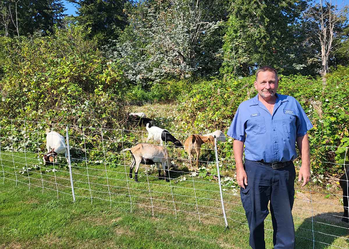 Dan Britton, grounds foreman at Holyrood Cemetery in Shoreline, Washington, is seen with a few of the goats that are busy clearing blackberry vines in an undeveloped area of the 36- hectare cemetery. (CNS photo/courtesy Holyrood Cemetery via Northwest Catholic )