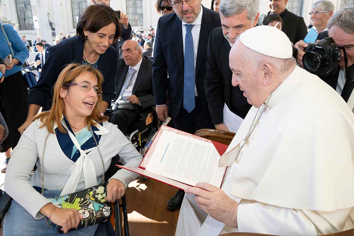 Pope Francis accepts a document on people with disabilities from Giulia Cirillo, a member of the Sant’Egidio community, at the end of the general audience in St. Peter’s Square at the Vatican Sept. 21, 2022. People with disabilities submitted a draft document to the Synod of Bishops on the needs of people with disabilities and their contributions to the life of the church. (CNS photo/Vatican Media)