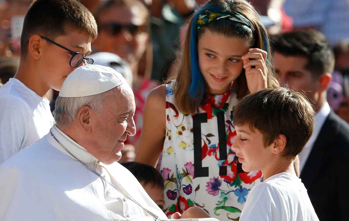 Pope Francis talks with children as they finish riding in the popemobile during the general audience in St. Peter’s Square at the Vatican Sept. 7, 2022. (CNS photo/Paul Haring)