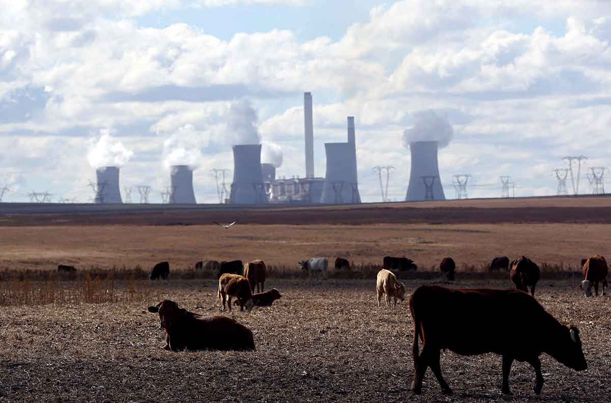 Cows graze as steam rises from the cooling towers of a coal-fired power plant in Middelburg, South Africa, May 20, 2018. (CNS photo/Siphiwe Sibeko, Reuters)