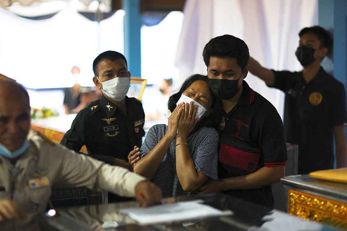 A woman reacts after identifying the body of a loved one at Sri Uthai temple in Na Klang, Thailand, Oct. 7, 2022, following of a mass shooting in Uthai Sawan. A former police officer facing a drug charge burst into the day care center Oct. 6, killing more than 30 people, including preschoolers, in the deadliest rampage in the nation’s history. (CNS photo/Athit Perawongmetha, Reuters)