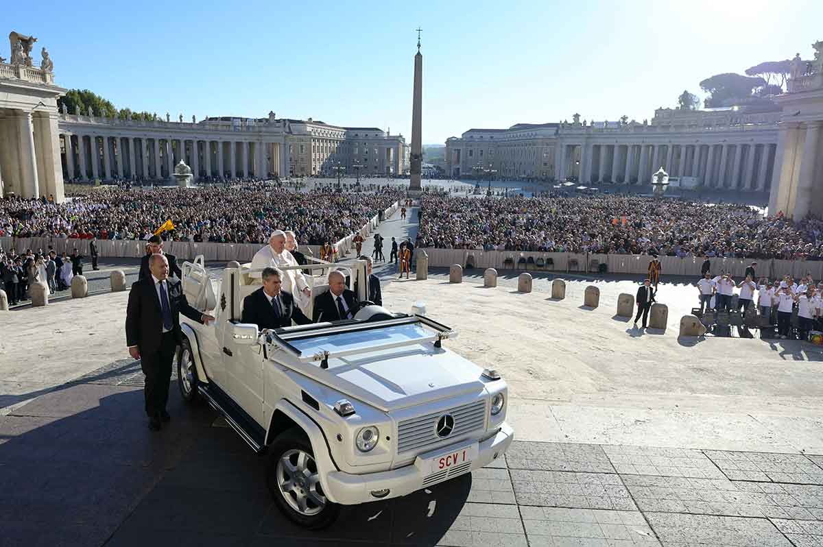 Pope Francis rides in the popemobile during his general audience in St. Peter’s Square at the Vatican Oct. 5, 2022. (CNS photo/Vatican Media)