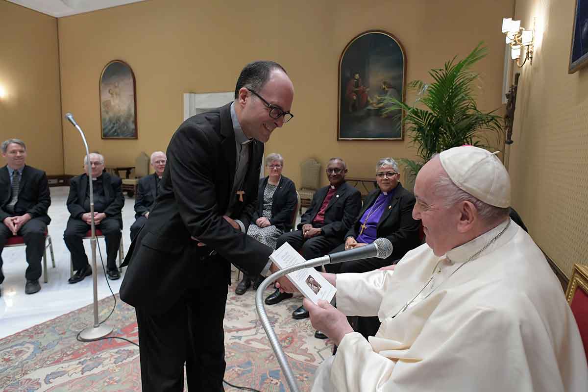 Pope Francis accepts a report from the Rev. Edgardo A. Colón-Emeric, dean of Duke University Divinity School in Durham, N.C., and the new Methodist co-chair of the Joint International Commission for Dialogue between the World Methodist Council and the Catholic Church, during an audience with members of the commission at the Vatican Oct. 5, 2022. (CNS photo/Vatican Media)