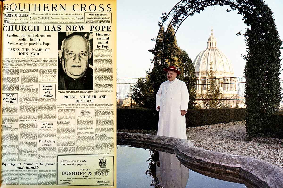(Left) The Southern Cross issue in 1958 introducing the newly-elected Pope John XXIII. (Right) The pope in the Vatican Gardens.