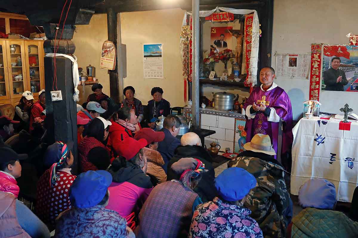 Posters of Chinese President Xi Jinping hang on the wall of the house of a Tibetan Catholic during a Mass celebrated by Father Yao Fei on Christmas Eve in Niuren village, in China’s Yunnan province, in this Dec. 24, 2018, file photo. (CNS photo/Tyrone Siu, Reuters)