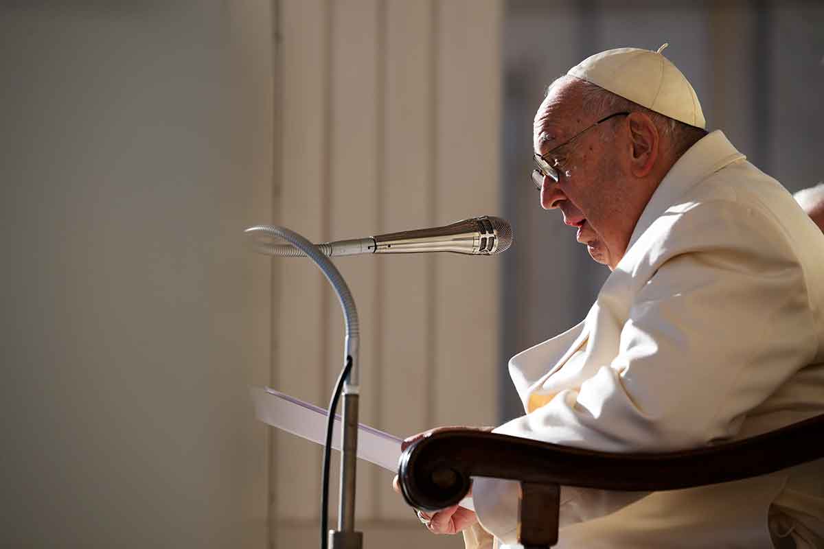 Pope Francis, speaking at his weekly general audience Nov. 23, 2022, prayed for peace in Ukraine and remembered the millions of Ukrainian victims of the 1932-33 Holodomor, a Soviet-engineered famine. (CNS photo/Vatican Media)