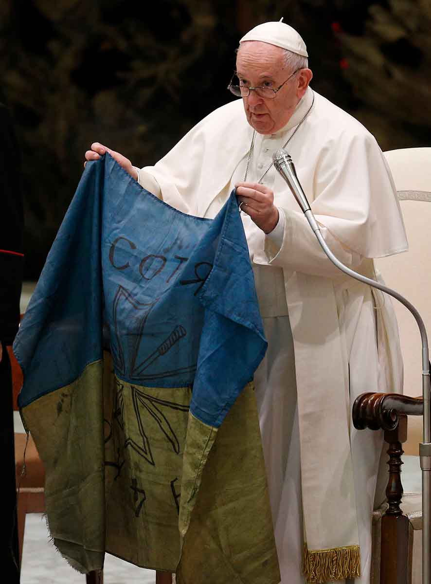 Pope Francis holds a Ukrainian national flag from Bucha during his general audience at the Vatican in this April 6, 2022, file photo. Meeting Jesuits in Kazakhstan in early September, the pope said too many people have taken a simplistic view of Russia’s war on Ukraine. (CNS photo/Paul Haring)