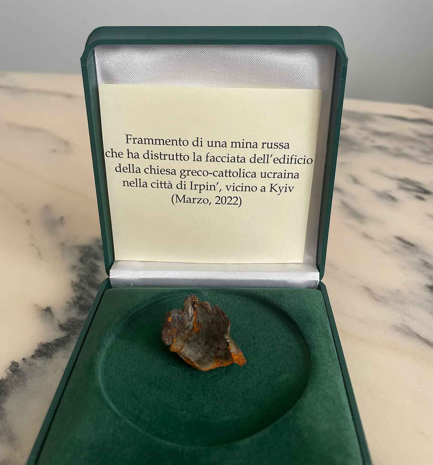 This is a fragment of a Russian mine that destroyed the façade of a Ukrainian Catholic church building in Irpin, Ukraine, in March and was given to Pope Francis Nov. 7, 2022, by Ukrainian Archbishop Sviatoslav Shevchuk of Kyiv-Halych. (CNS photo/Courtesy of the archbishop’s office)