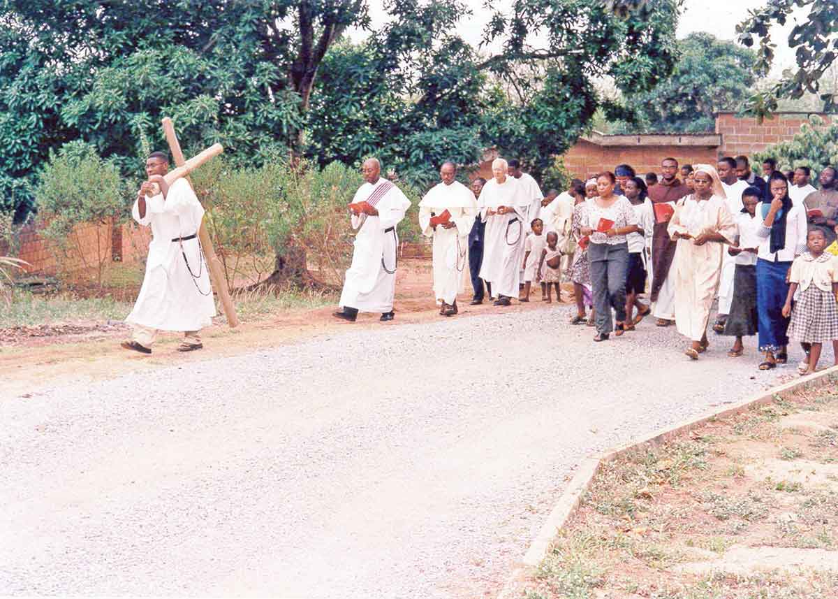 People in Ibadan, Nigeria, participate in the Stations of the Cross in this undated photo from Dominican Father Justus Pokrzewinski’s time as a missionary in Nigeria. About 200 people from the community would join each week, said the priest, who spent 57 years in the African country before beginning his ministry to college students in Indiana four years ago. (CNS photo/courtesy Dominican Father Justus Pokrzewinski via The Criterion)