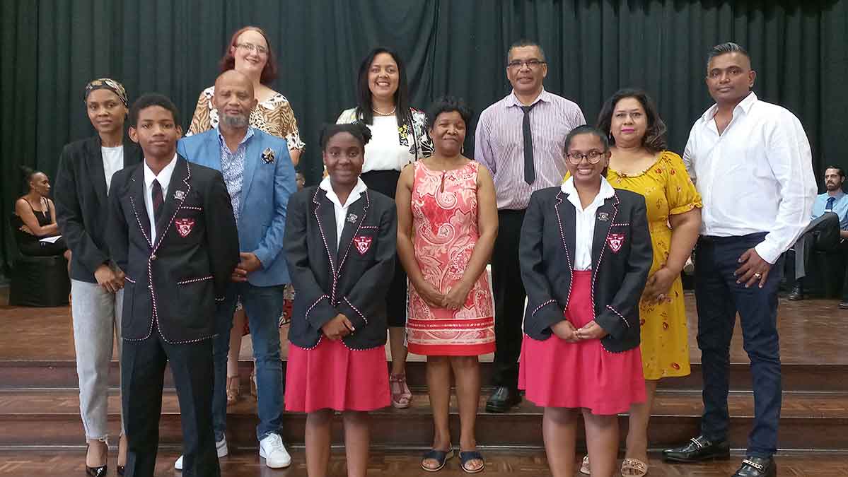 High School HOD Mrs Ross, Principal Mrs Collings and Deputy Head Mr Sutherland with our newly appointed 2023 Deputy Head Prefect Kwenzakwenkosi Gcabashe, Head Prefect Lufuno Masuku and Deputy Head Prefect Sydelle Chetty, pictured with proud parents.