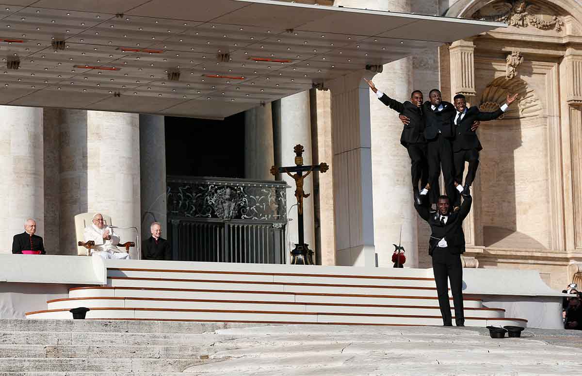 Pope Francis watches as a group of five Kenyan acrobats perform as the Black Blues Brothers during his general audience in St. Peter’s Square at the Vatican Nov. 30, 2022. (CNS photo/Paul Haring)