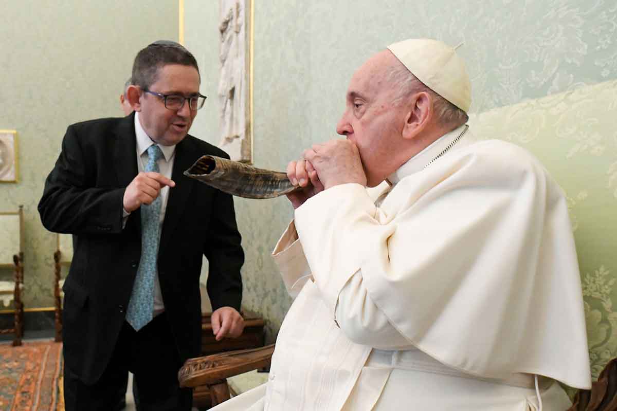 Pope Francis blows into a shofar presented by Rabbi Ariel Stofenmacher, rector of the Latin American Rabbinical Seminary, during an audience with a delegation from the seminary at the Vatican on Dec. 2, 2022. (CNS photo/Vatican Media)