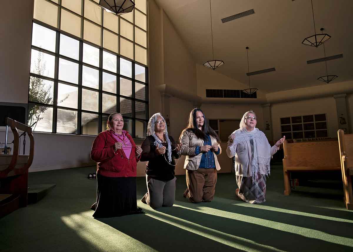 Members of the Seven Sisters Apostolate at St. Pius X Catholic Church in Atlanta pray for Father Javier Muñoz, their parochial vicar, in this undated photo. Pictured from left are María De La Luz Silva, Fermina Consla, Hilda Pelayo and Olga Jennings. (CNS photo/Johnathon Kelso, The Georgia Bulletin)