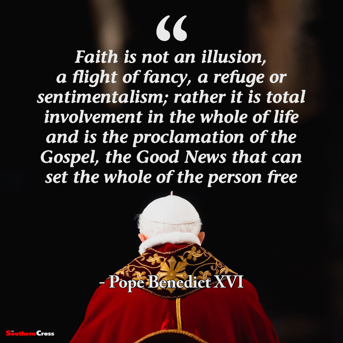 “Faith is not an illusion, a flight of fancy, a refuge or sentimentalism; rather it is total involvement in the whole of life and is the proclamation of the Gospel, the Good News that can set the whole of the person free.”