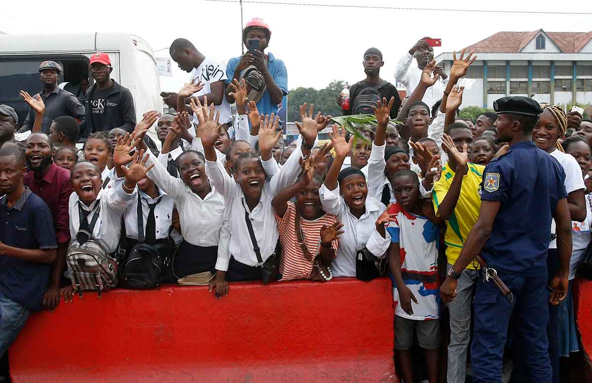 People cheer as they wait for Pope Francis to pass on a road near the international airport in Kinshasa, Congo, Jan. 31, 2023. (CNS photo/Paul Haring)