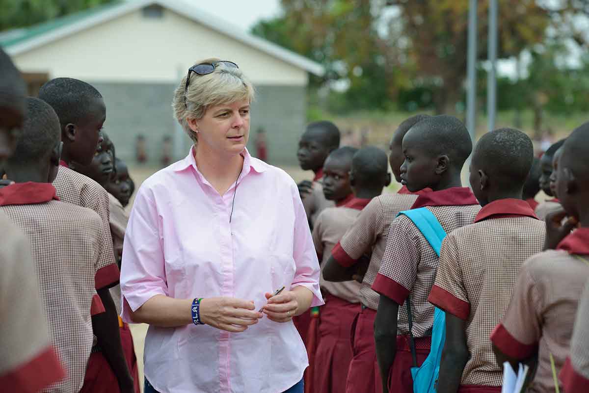 Loreto Sister Orla Treacy, principal of Loreto Girls Secondary School in Rumbek, South Sudan, walks outside the school with children in this April 20, 2017, file photo. Sister Treacy has fought for decades in South Sudan against the practice of forcing young women into early marriage. (CNS photo/Paul Jeffrey)