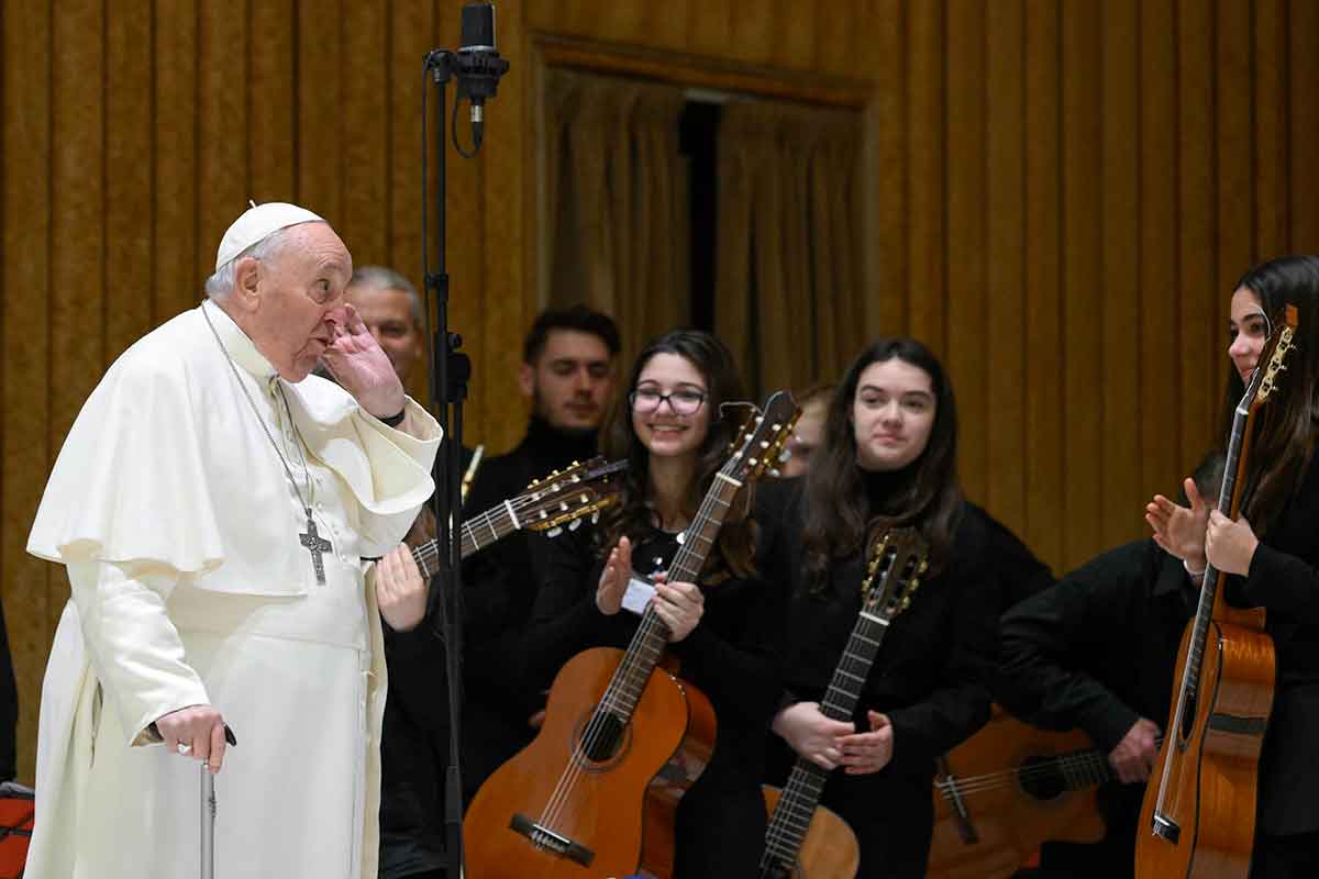 Pope Francis greets members of a youth orchestra from Carpi, Italy, before his weekly general audience in the Vatican audience hall Feb. 15, 2023. (CNS photo/Vatican Media)