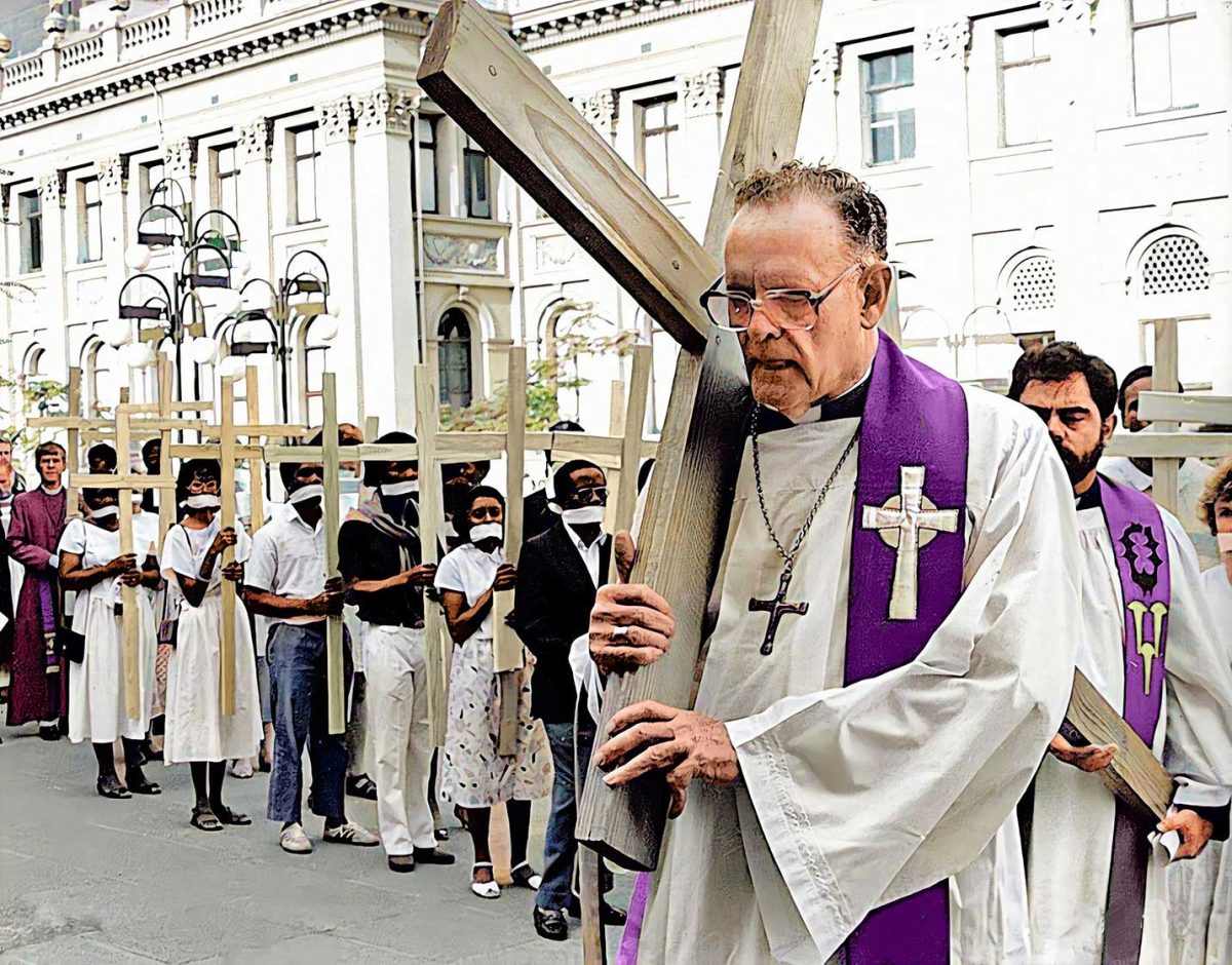 Archbishop Denis Hurley OMI, carrying a large cross, leads an ecumenical group of people past Durban’s Central Post Office during
