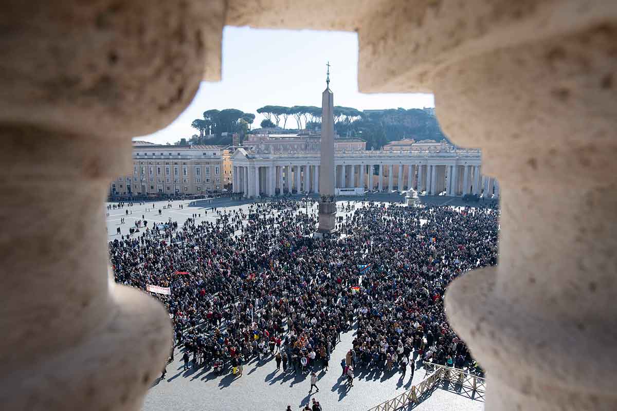 Visitors gather in St. Peter’s Square as Pope Francis leads the Angelus from the window of his studio at the Vatican on Feb. 12, 2023. (CNS photo/Vatican Media)
