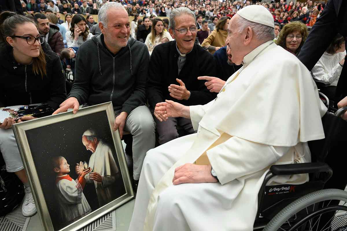 Pope Francis looks at a painting of himself as he greets people at the end of his weekly general audience in the Vatican audience hall Feb. 8, 2023. (CNS photo/Vatican Media)