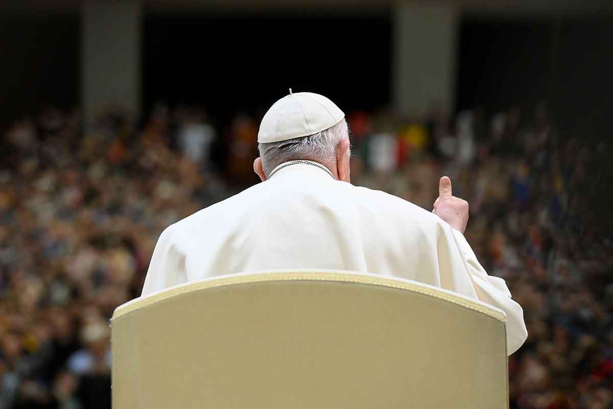 Pope Francis gives a thumbs up during his weekly general audience in the Vatican audience hall Feb. 8, 2023. (CNS photo/Vatican Media)