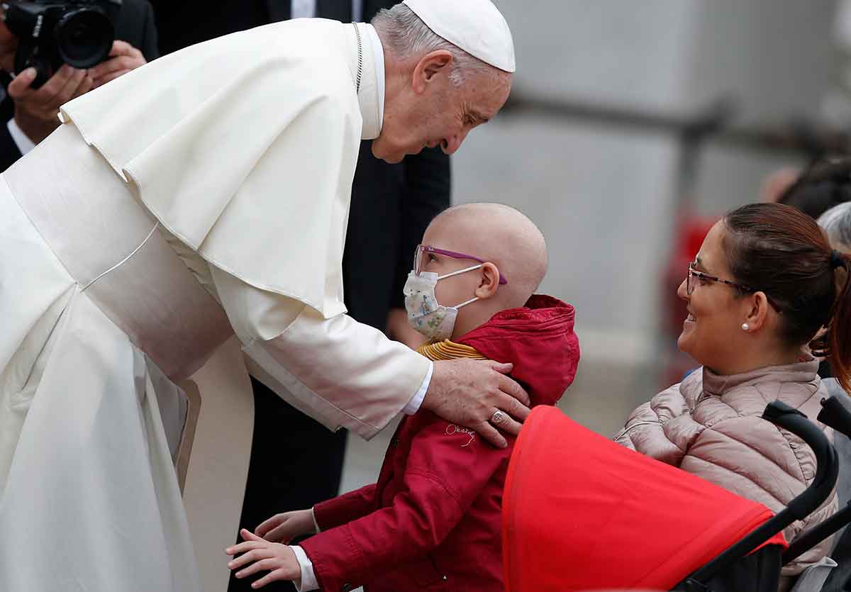 Pope Francis greets a sick boy during his general audience in St. Peter’s Square at the Vatican in this Oct. 17, 2018, file photo. In his message for the 2023 World Day of the Sick, the pope said the way we treat those who are ill shows exactly what kind of a community we are. (CNS photo/Paul Haring)