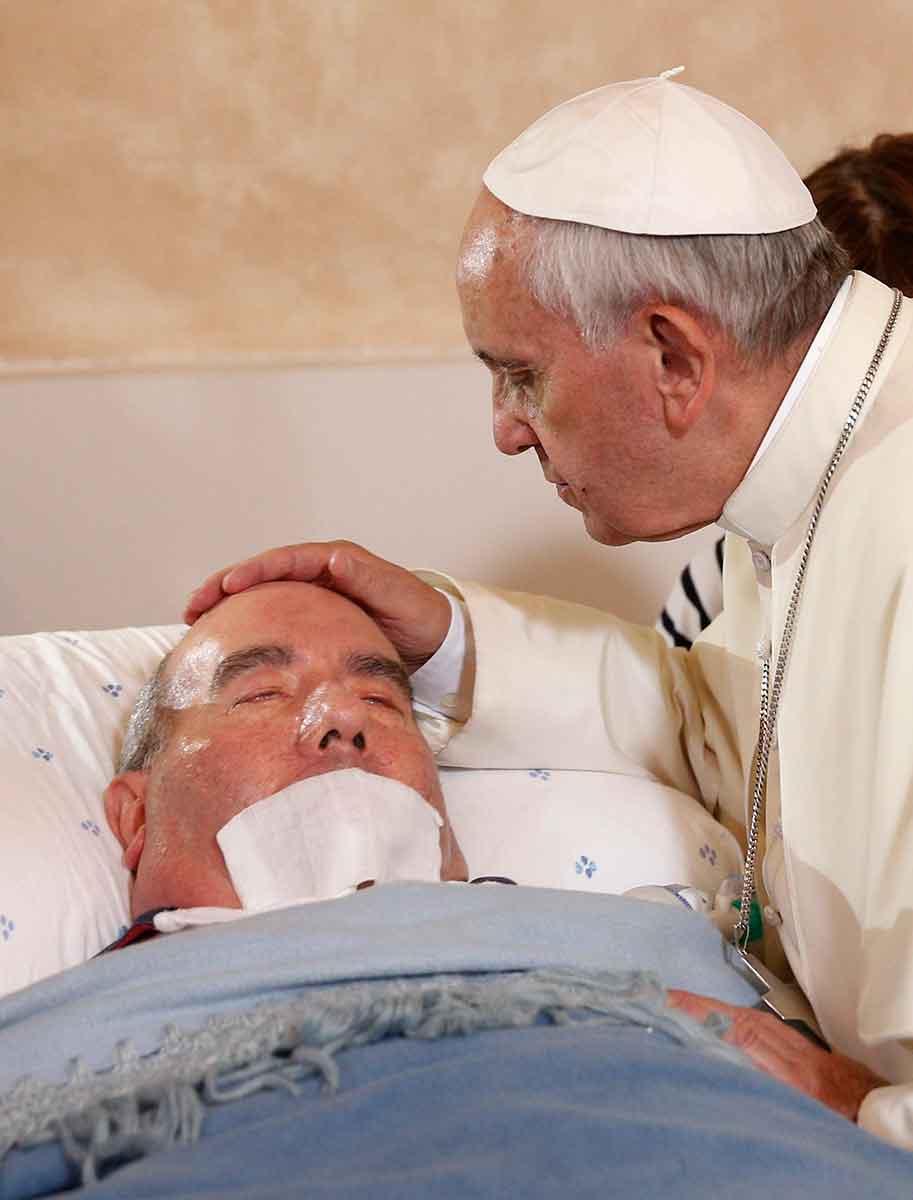 Pope Francis blesses a sick man inside the Basilica of Our Lady of Bonaria in Cagliari, Sardinia, in this Sept. 22, 2013, file photo. In his message for the 2023 World Day of the Sick, the pope said the way we treat those who are ill shows exactly what kind of a community we are. (CNS photo/Paul Haring)