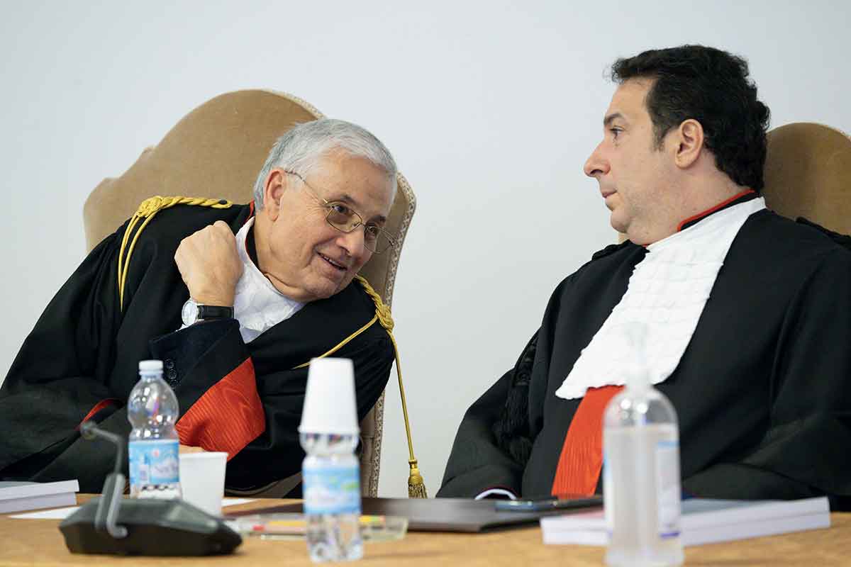 Giuseppe Pignatone, president of the Vatican City State criminal court, and Carlo Bonzano, a fellow judge, consult March 9, 2023, during the trial of Cardinal Angelo Becciu and nine others on charges of financial malfeasance. (CNS photo/Vatican Media)