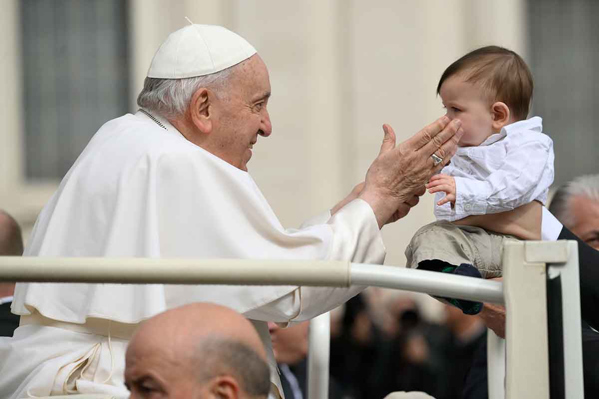 Pope Francis greets a baby as he rides around St. Peter’s Square at the Vatican before his weekly general audience March 8, 2023. (CNS photo/Vatican Media)