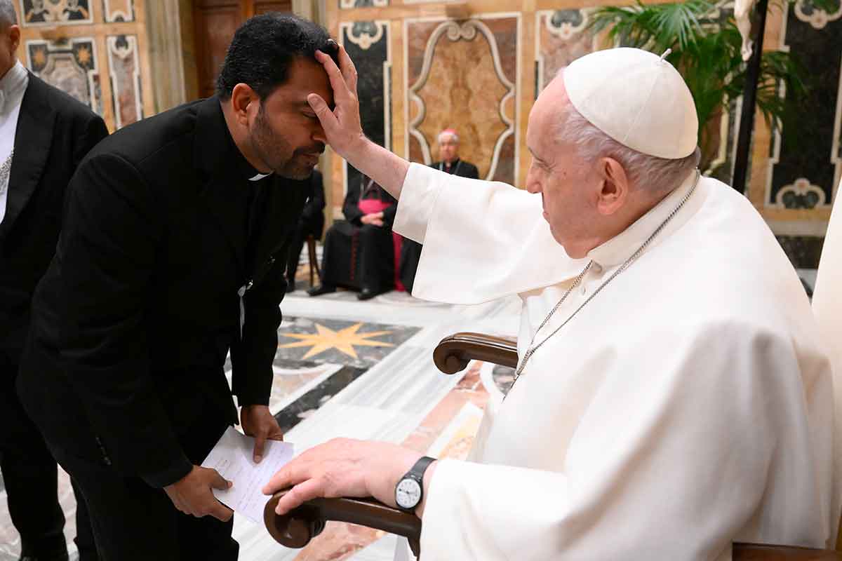 Pope Francis blesses a priest at the end of an audience Feb. 18, 2023, with participants in a canon law course sponsored by the Roman Rota, a Vatican tribunal dealing primarily with marriage cases. (CNS photo/Vatican Media)