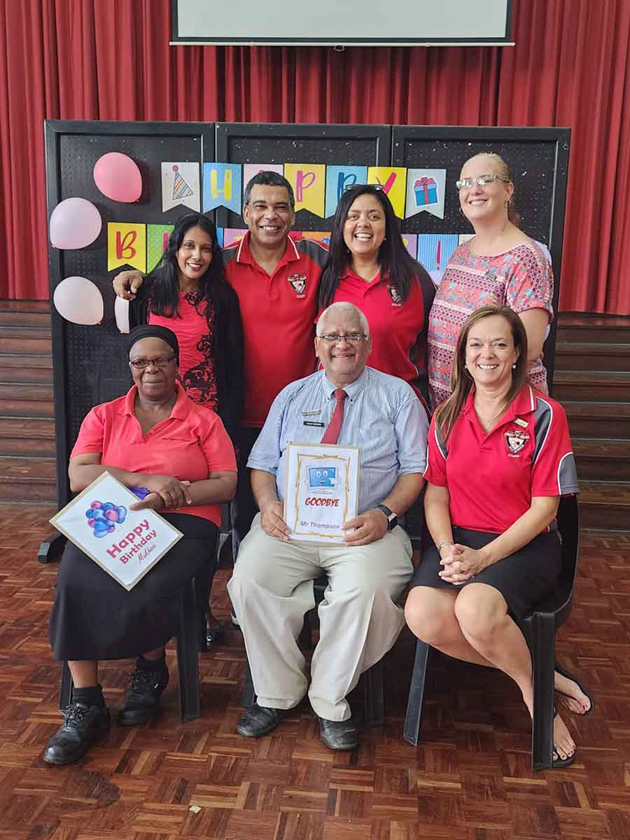 Back: Mrs Naicker (Primary School HOD), Mr Sutherland (Deputy Head), Mrs Collings (Principal), Mrs Ross (High School HOD). Front: Makhosi Sithole (Ground Staff), Mr Thompson (CAT/Maths Teacher) and Jackie Chowles (Marketing and Admissions).