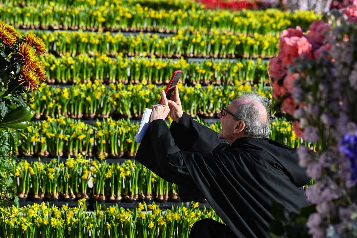 A monk takes a photo of the daffodils and thousands of other flowers donated by growers in the Netherlands to decorate St. Peter’s Square at the Vatican for Easter morning Mass with Pope Francis April 9, 2023. (CNS photo/Chris Warde-Jones)