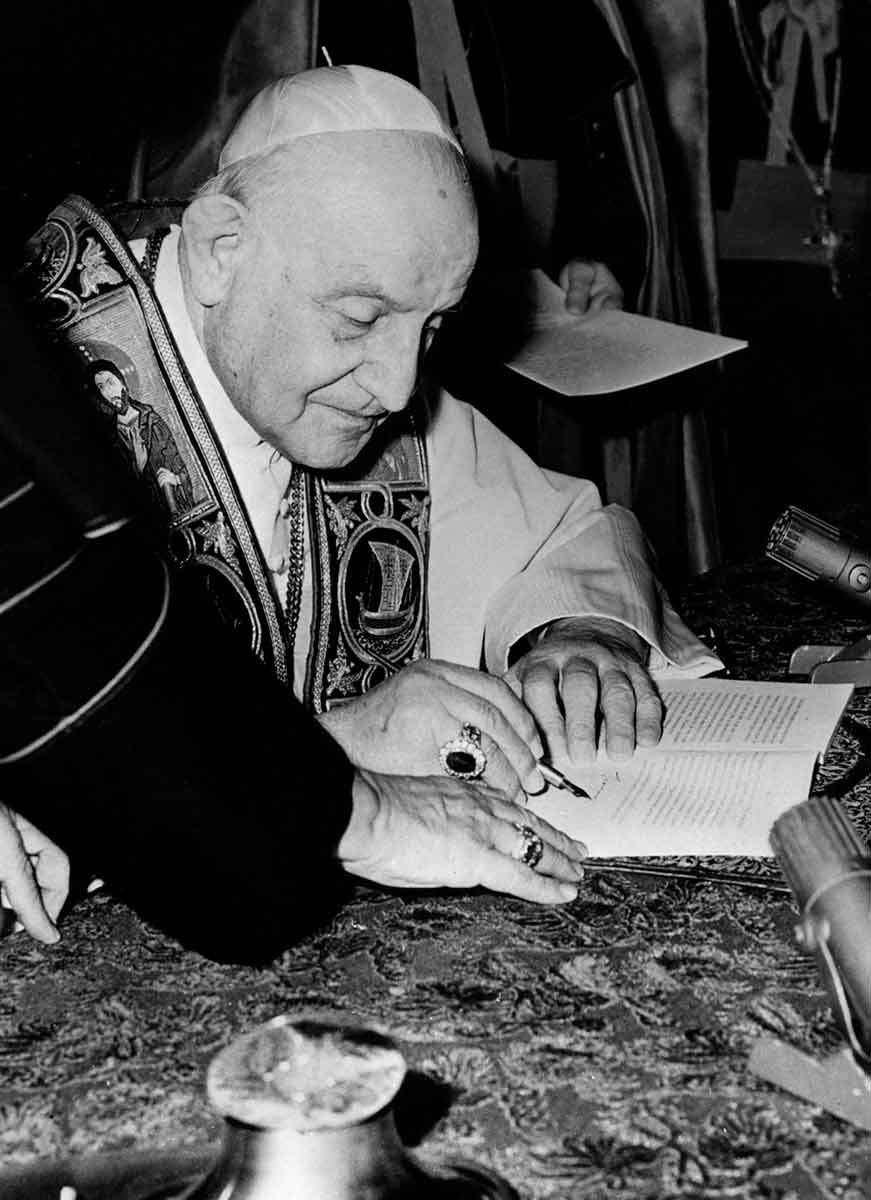 Pope John XXIII signs his encyclical “Peace on Earth” (“Pacem in Terris”) at the Vatican in this 1963 file photo. (CNS photo)