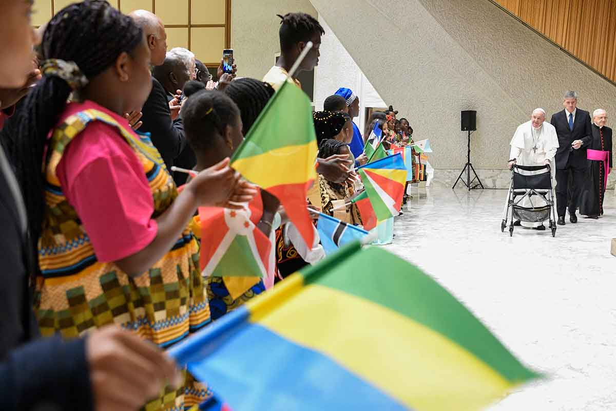Pope Francis arrives for a meeting with children and teens from across Africa, as well as with their parents and ambassadors to the Holy See from the continent, May 29, 2023, in the Vatican audience hall. The audience marked Africa Day, the anniversary of the founding of the African Union. (CNS photo/Vatican Media)