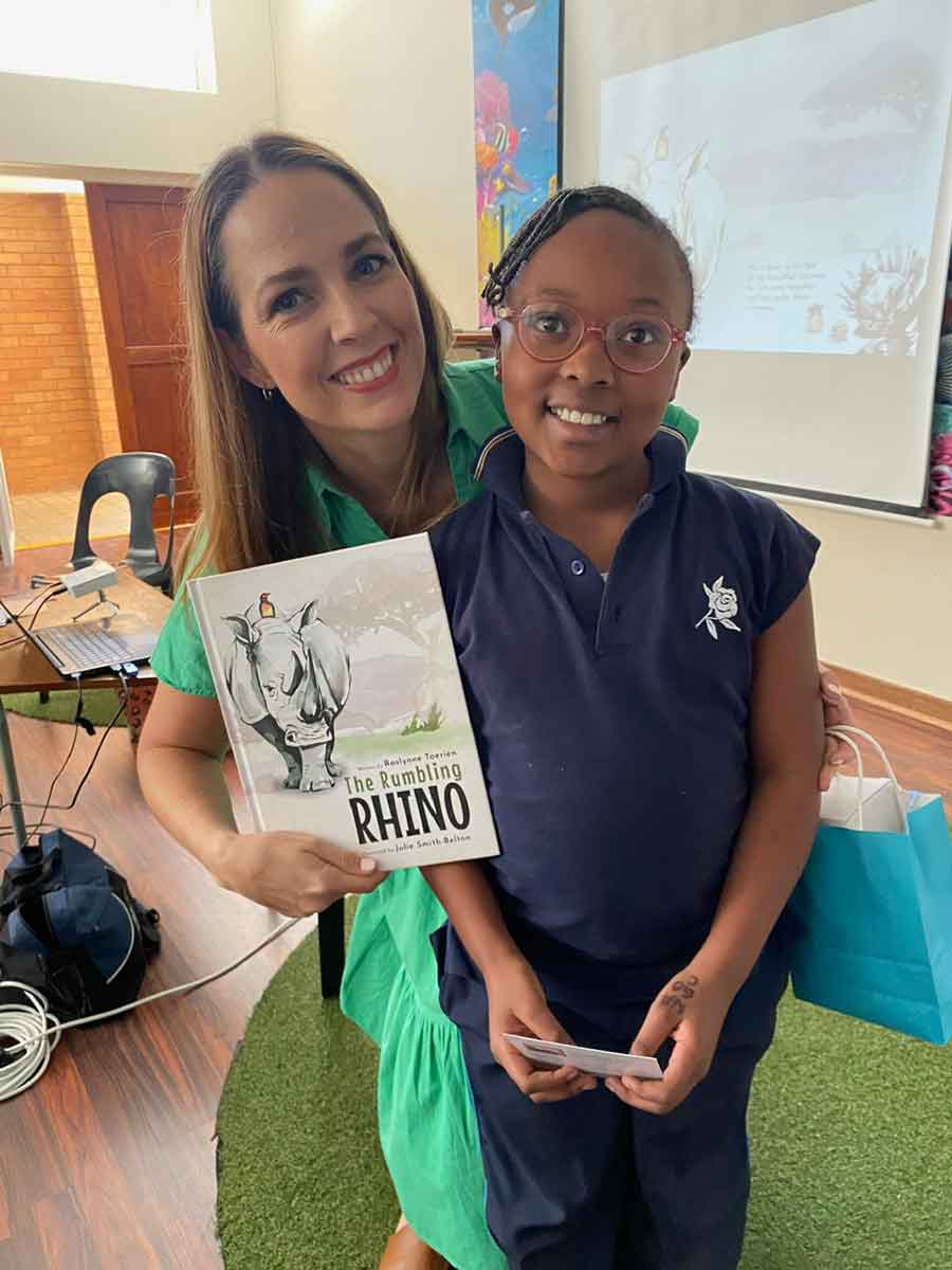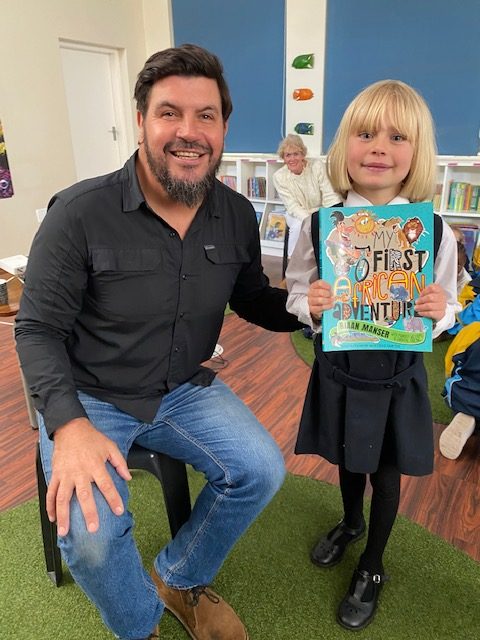Author Riaan Manser with Zoey-Rae Saffy (Grade 1)